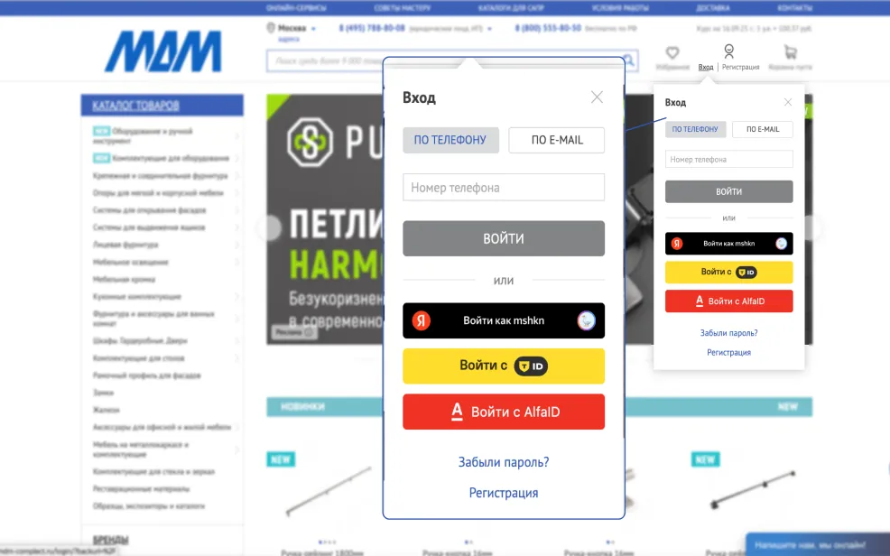 • При наведении курсора на «Каталог товаров» откроется двухуровневое меню, где слева указаны названия основных разделов, а справа — соответствующие подразделы;