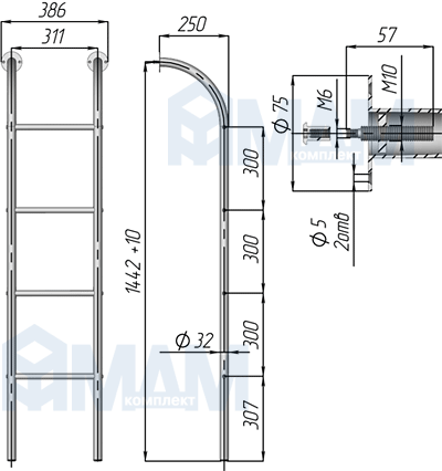 Лестница D32/1442мм, шир. 386 мм, разборная, хром матовый