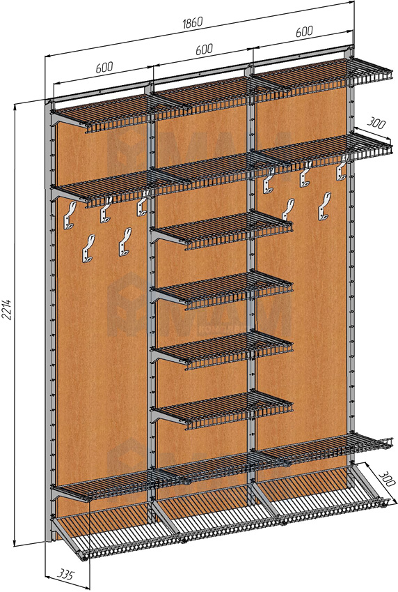 Home Space, гардероб ширина 1860мм, глубина 335 мм, 3 проема по 600 мм