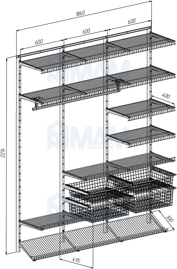 Home Space, гардероб ширина 1860мм, глубина 495 мм, 3 проема по 600 мм