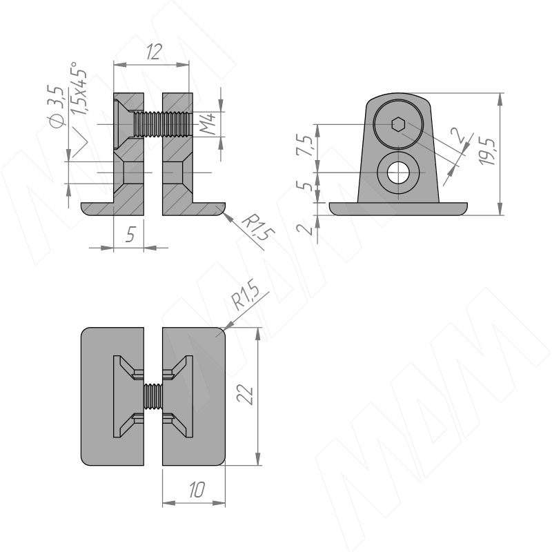 Размеры центрального крепления VERTIKO для алюминиевой полки (артикул VR04CC)