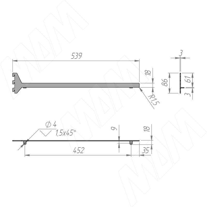Размеры правого полкодержателя VERTIKO для деревянной полки 18 мм (артикул VR5018R)