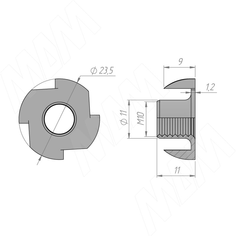 Установка усовой гайки М6 (артикул C0) Диаметр сверления — 12 мм.