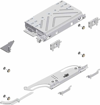 Комплектация: верхний ролик, верхний стопор, верхнее крепление для фасада — 2 шт., нижний ролик, нижний стопор, нижнее крепление для фасадов — 2 шт., угловой демпфер — 4 шт.