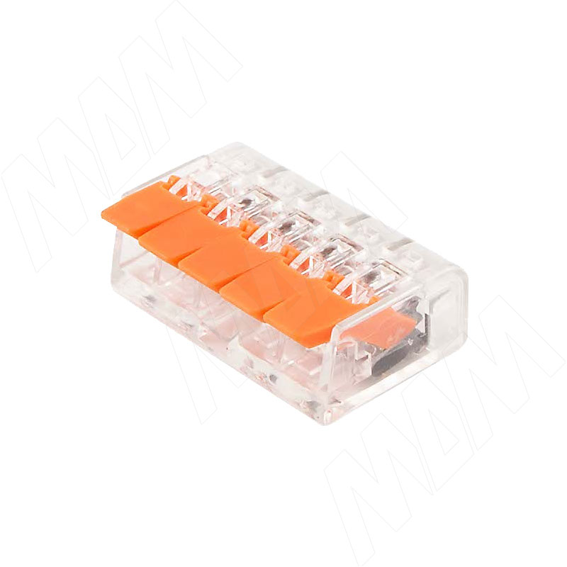 Клемма 221 с рычажком, 5 портов, для провода 0.5-4.0 кв.мм, ток 16А, оранжевый