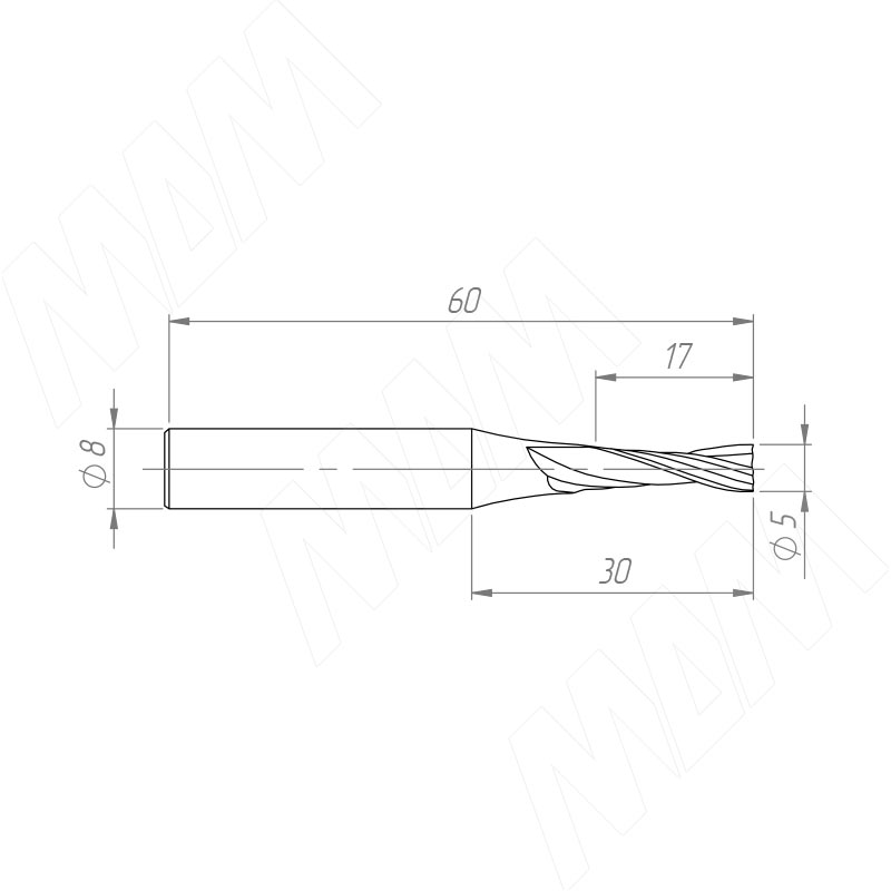 Фреза спиральная твердосплавная D5xL17, S8xGL60, Z2, Up/Rh, чистовая