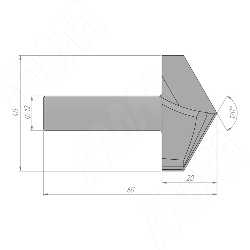 Фреза профильная V образная 120° D=40 H=20, S=12, Z=2, ? = 120