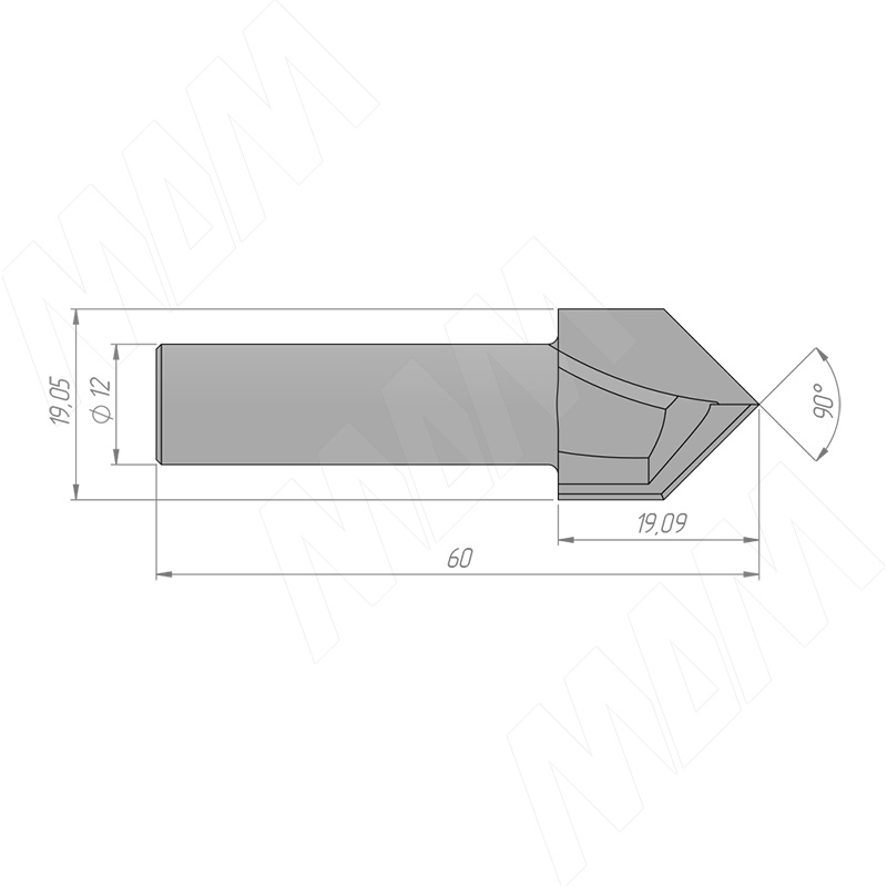 Фреза профильная V образная 90° D=19,05 H=19,05 S=12, Z=2, ? = 90