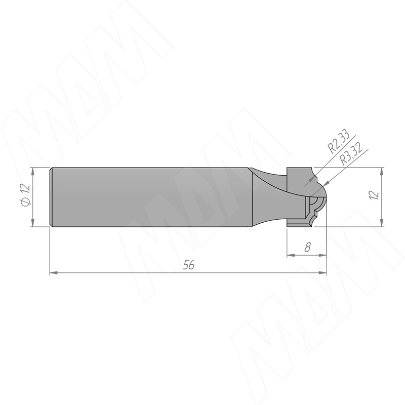 Размеры фрезы профильной D=12 H=8 S=12 Z=2 R1=3,32 R2=2,33 (артикул C110-12-8S12)