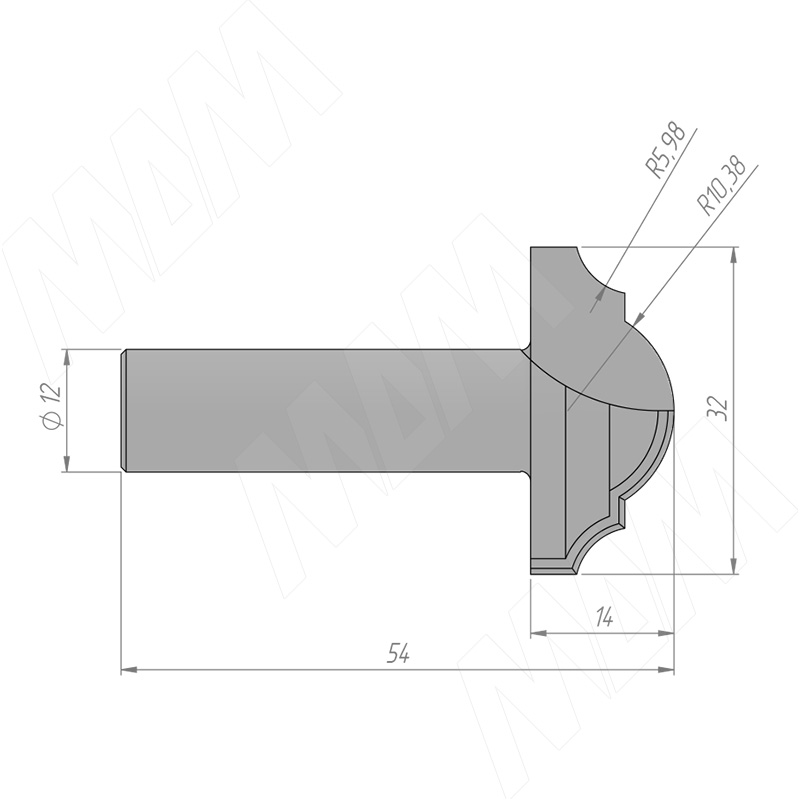 Размеры фрезы профильной  D=32 H=14 S=12 Z=2 R1=10,38 R2=5,98 (артикул C110-32-14S12)
