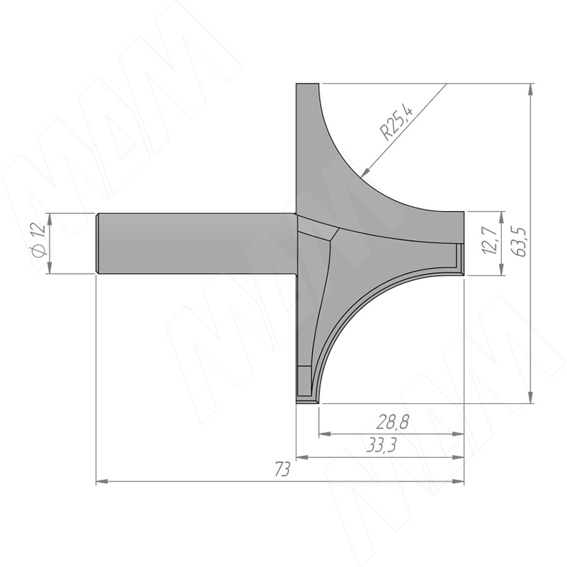 Фреза профильная D=63,5 d=12,7 H=33,3 S=12 Z=2 R1=25,4