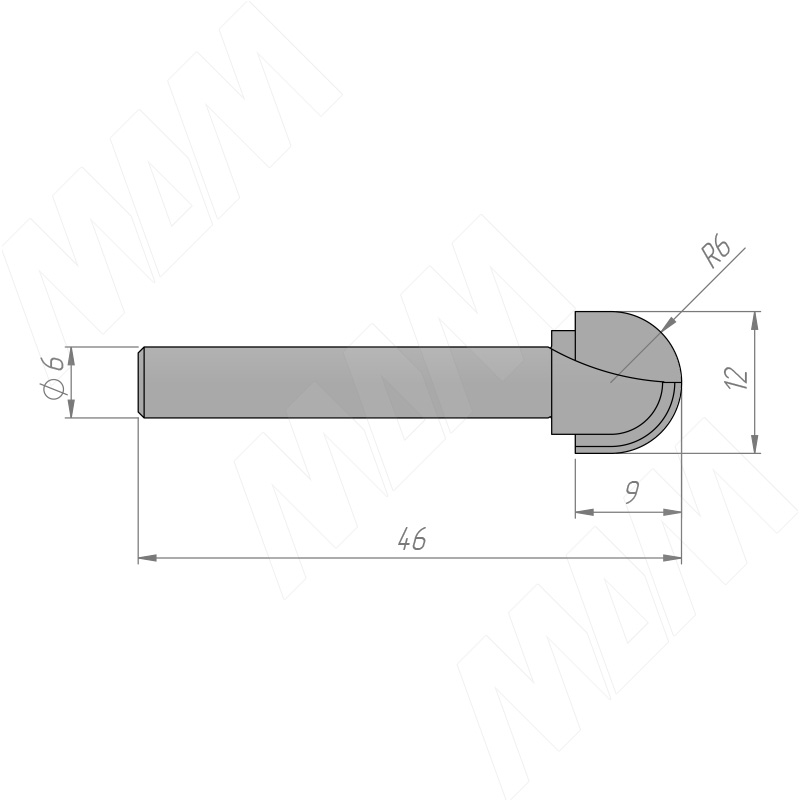 Размеры фрезы профильной D=12 H=9 S=6 Z=2 R1=6 (артикул C113-12-9S6)