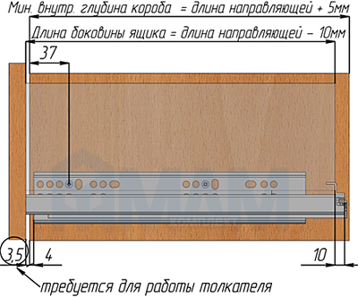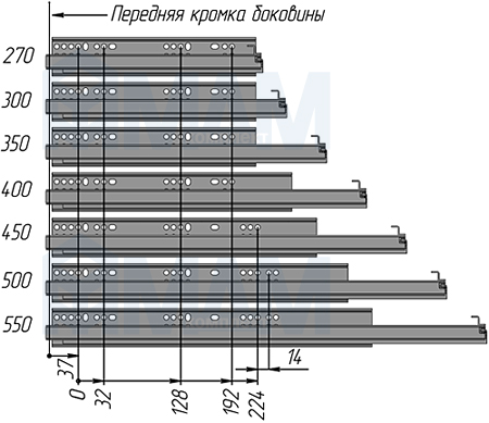 Направляющие 450 мм, ниж. крепл. полн. выдвижения, с толкателем