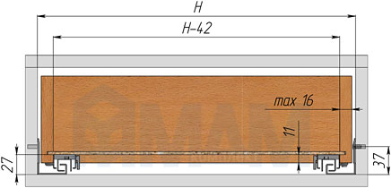 Установить ящик так, чтобы крюк на направляющей вошел в отверстие на задней стенке ящика.