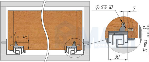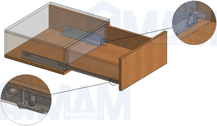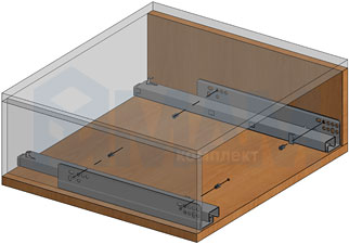 • насадной монтаж — ящик под наклоном насаживается сверху на выдвинутые направляющие;