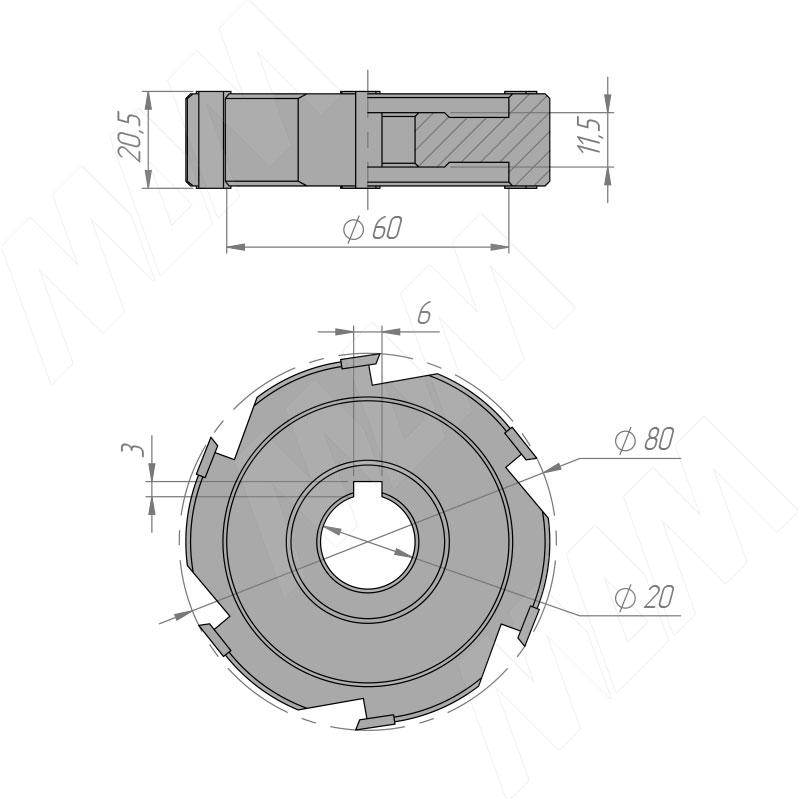 Размеры фрезы для снятия свесов D80xd20xh20 6Z RH/LH (артикул 5610090008-R/L)