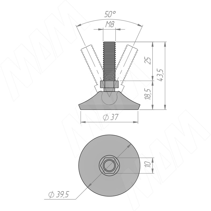 Размеры мебельной ножки на подвижном шарнире, M8x25 мм (артикул PI77.M8x25)Установка мебельной ножки на подвижном шарнире, M8x25 мм (артикул PI77.M8x25)