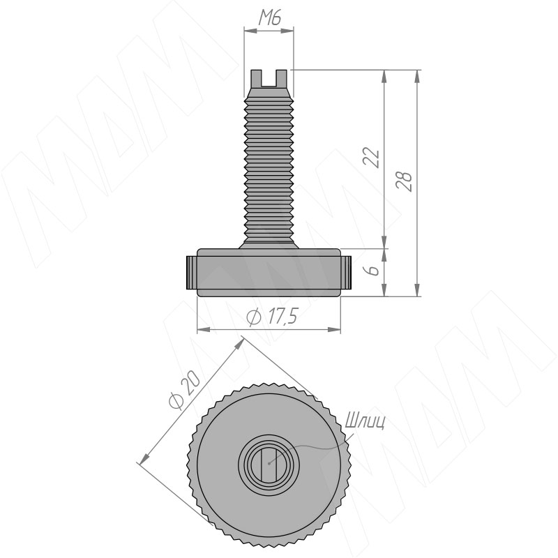 Размеры мебельной ножки М6x20 мм (артикул PI10 M6 X 20)Установка мебельной ножки (артикул PI10)Регулировка мебельной ножки (артикул PI10)