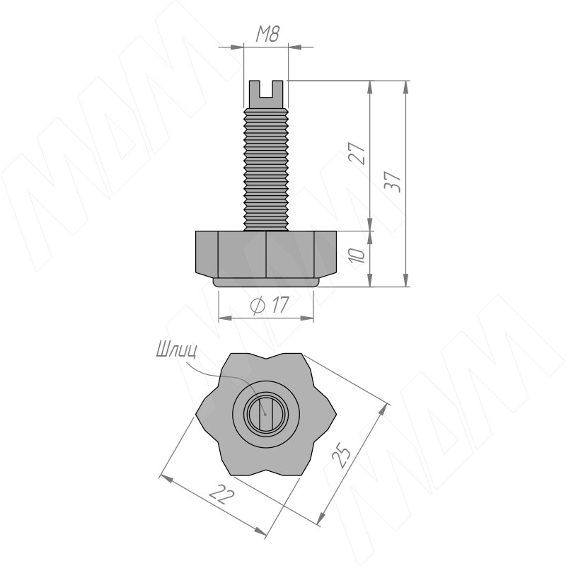 Оставьте свой отзыв о товаре: Ножка мебельная с прямым шлицем, под регулировку, М8x27, черная (PI14)