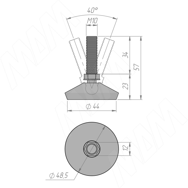 Размеры мебельной ножки М10x34 мм на подвижном шарнире (артикул PI77)Установка мебельной ножки М10x34 мм на подвижном шарнире (артикул PI77)Использование мебельной ножки М10x34 мм на подвижном шарнире (артикул PI77)