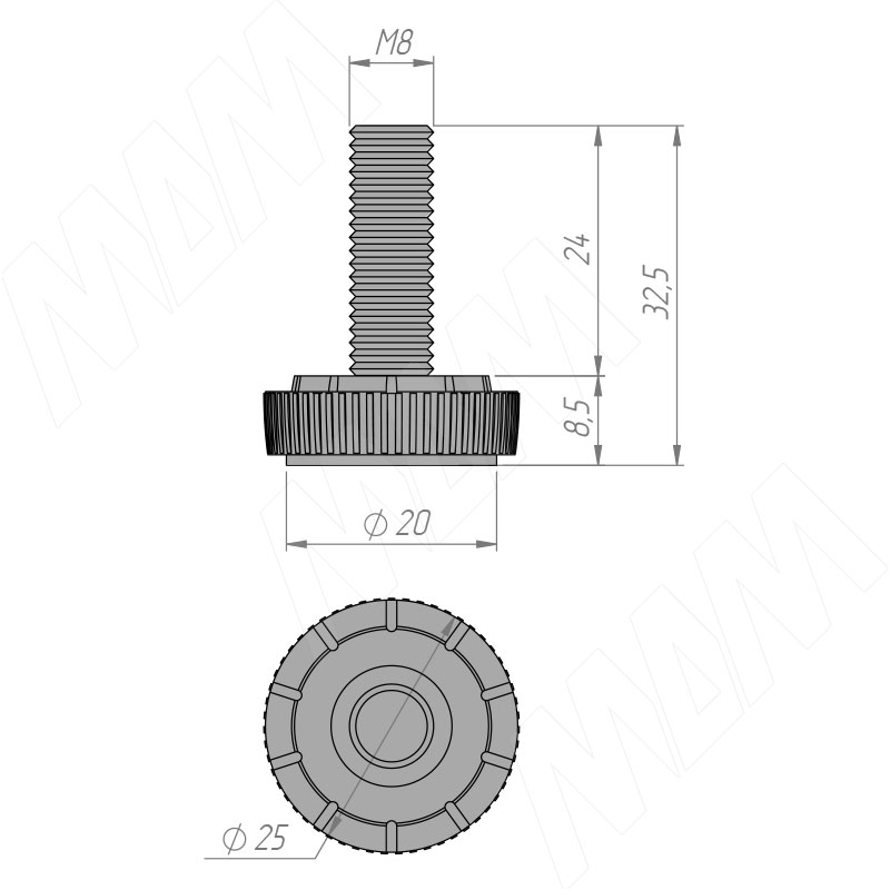 Размеры мебельной ножки М8x25 мм (артикул PI02 M8 X 25R)Размеры мебельной ножки (артикул PI01, PI02, PI03)