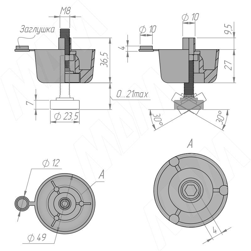 Размеры мебельной ножки, высота 27 мм, регулировка 21 мм (артикул PI04-CH) Установка мебельной ножки, высота 27 мм, регулировка 21 мм (артикул PI04-CH)Установка мебельной ножки (артикул PI04, PI08 и PI09)