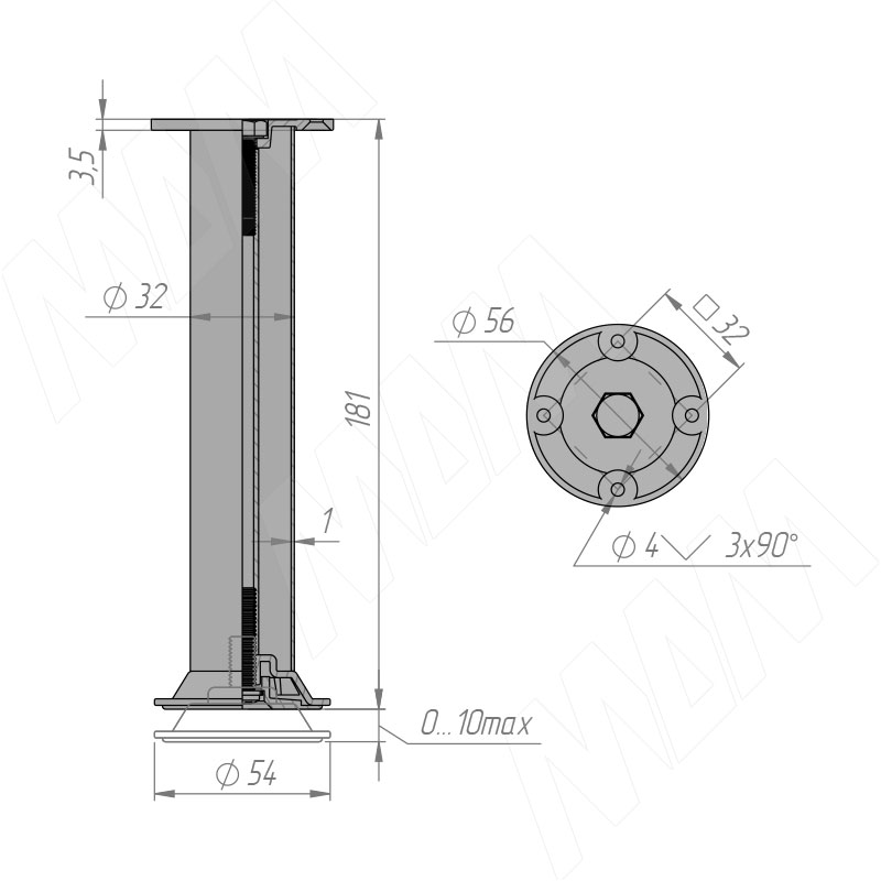 Размеры декоративной опоры, диаметр 32 мм, высота 180 мм, регулировка 10 мм (артикул NA10C00/R 180ММ)