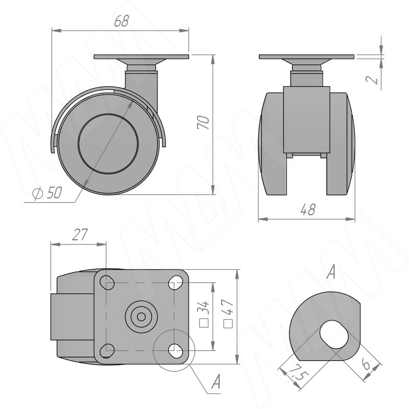 Размеры двухколесной опоры с площадкой, диаметр 50 мм, без стопора (артикул W01)Установка двухколесной опоры с площадкой, диаметр 50 мм, без стопора (артикул W01)