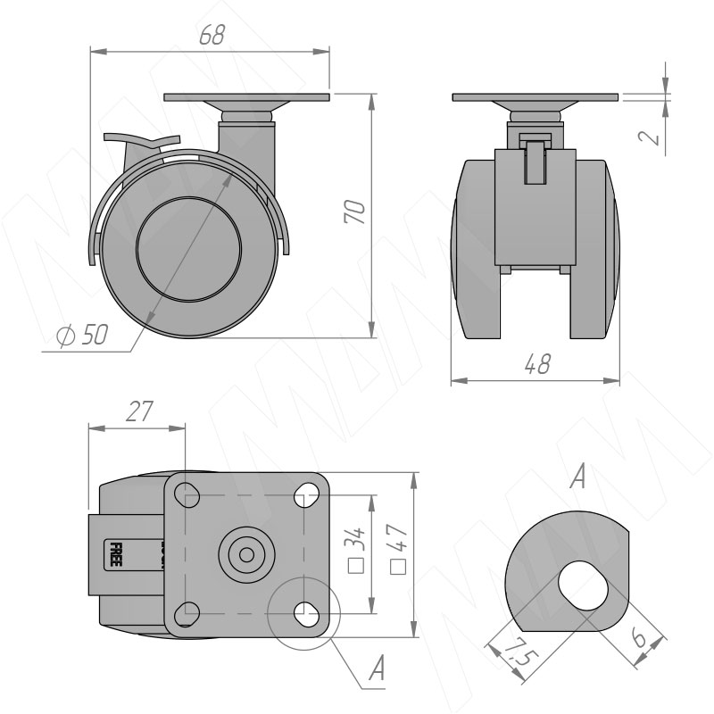 Размеры двухколесной опоры с площадкой, диаметр 50 мм, со стопором (артикул W01B)Установка двухколесной опоры с площадкой, диаметр 50 мм, со стопором (артикул W01B)