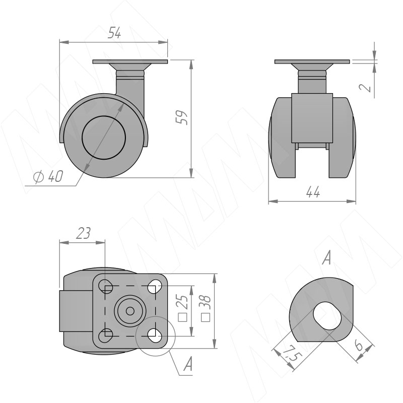 Размеры двухколесной опоры с площадкой, диаметр 40 мм, без стопора (артикул W04)Установка двухколесной опоры с площадкой, диаметр 40 мм, без стопора (артикул W04)