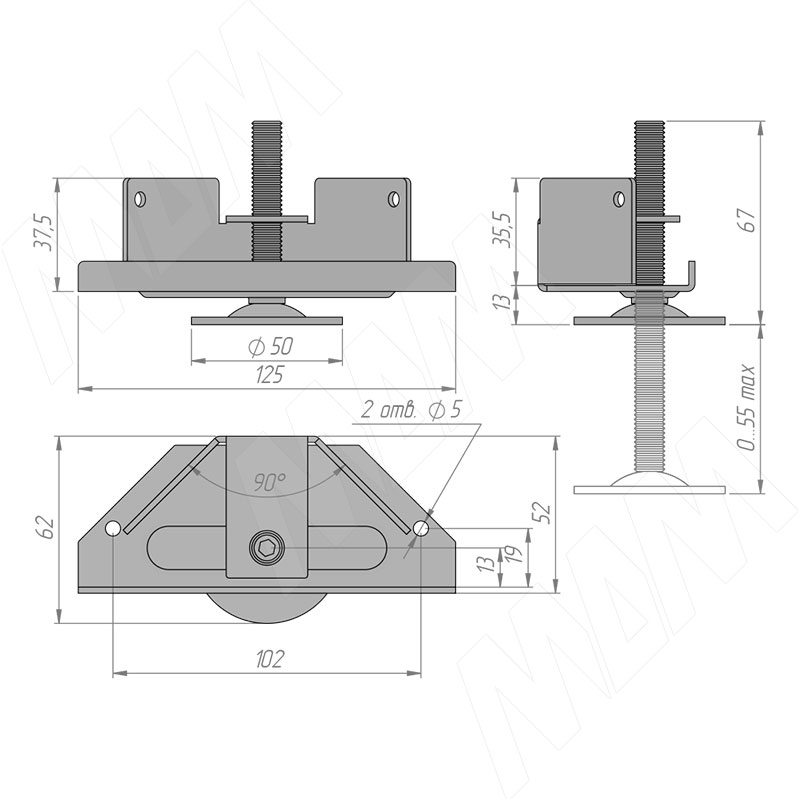 Размеры универсальной регулируемой опоры M10x63 мм с поддержкой 2 боковин (артикул LEV-M10X63.D)Установка универсальной регулируемой опоры M10x63 мм с поддержкой 2 боковин (артикул LEV-M10X63.D)