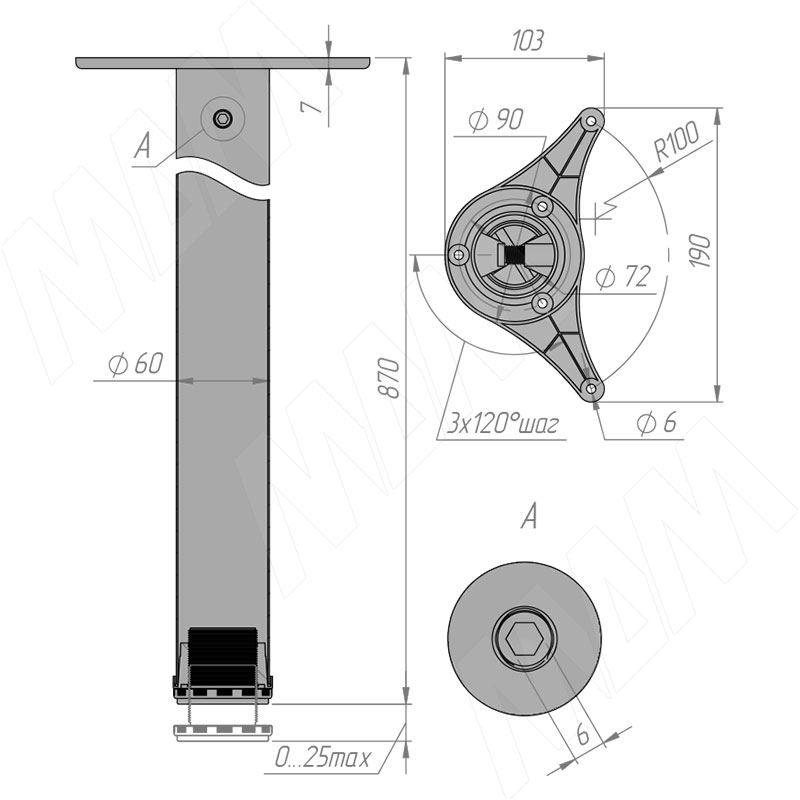 Размеры опоры для стола, диаметр 60 мм, высота 870 мм, регулировка 25 мм (артикул X4RG 870)