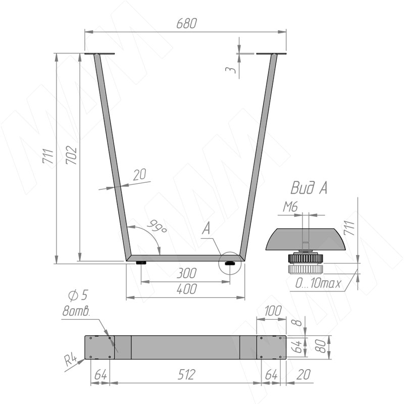 Размеры V-образной опоры для стола, сечение 80х20 мм, высота 711 мм, регулировка 10 мм (артикул V80X20/715)