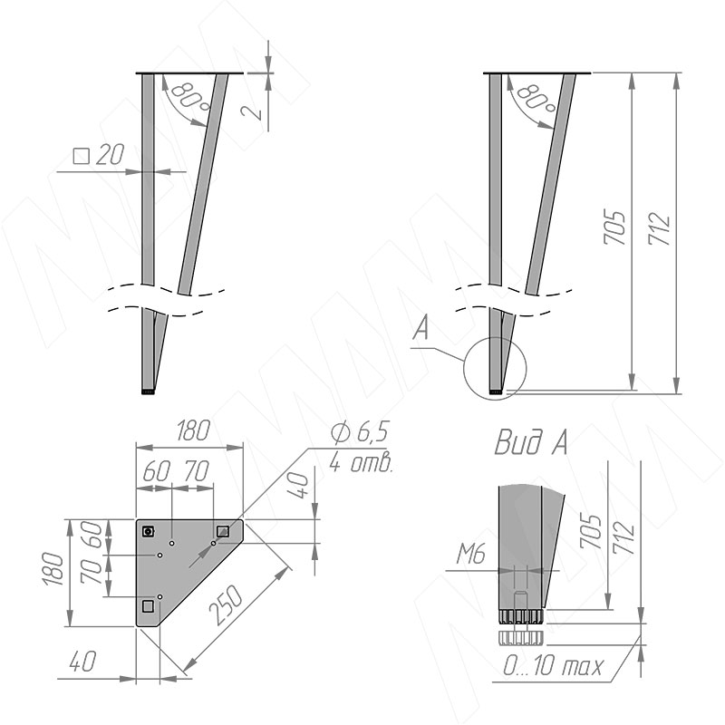 Размеры V-образной опоры PIN для стола, 180x712 мм, регулировка 10 мм (артикул PIN180x715)