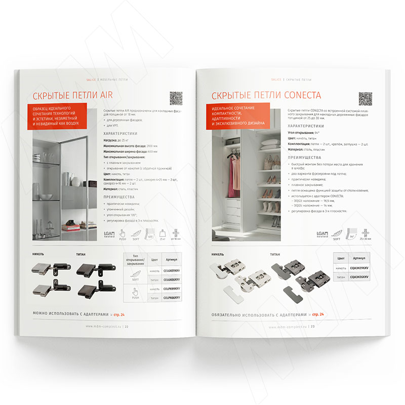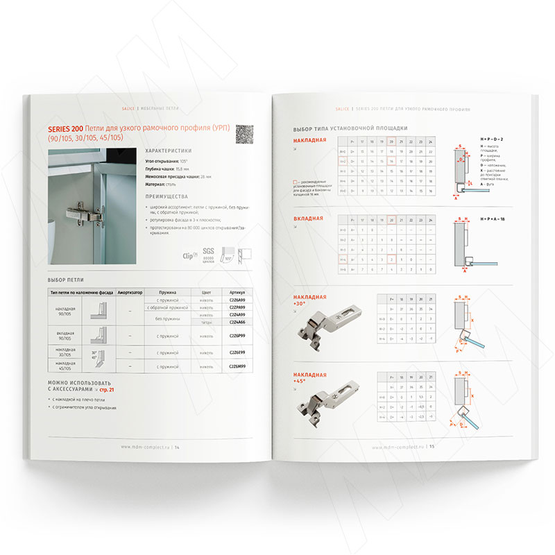 В каталоге представлен актуальный ассортимент мебельных петель итальянской компании Salice, мирового лидера по производству высококачественных комплектующих для мебели: