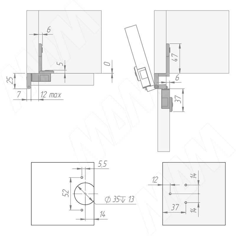 Установка одношарнирной накладной петли с наложением 12 мм (артикул HJ-082203-19), схема 1Установка одношарнирной накладной петли с наложением 12 мм (артикул HJ-082203-19), схема 2