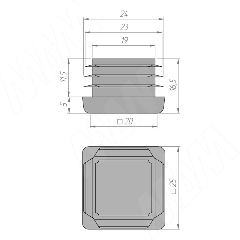 Размеры заглушки-подпятника (артикул 25Х25Х1,2Н)