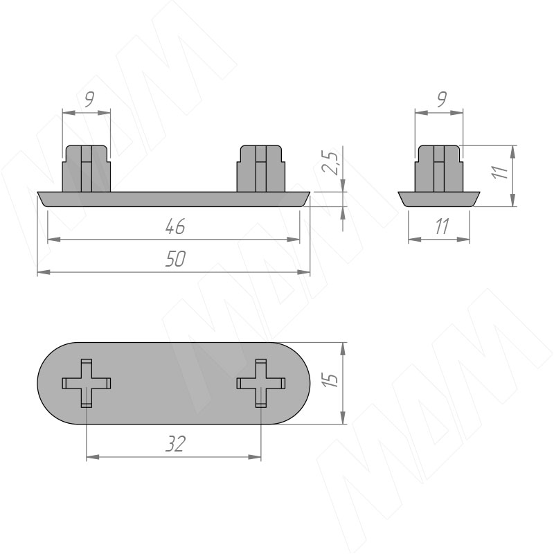 Подпятник двойной 32x15 мм, под отверстие 9 мм, черный