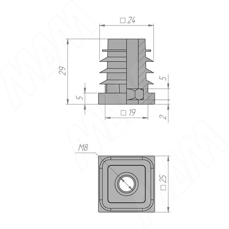 Размеры заглушки-подпятника с гайкой М8 (артикул 25Х25 M8)