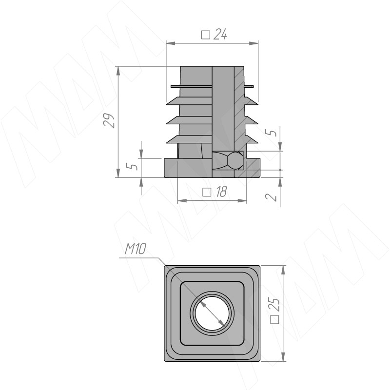 Размеры заглушки-подпятника с гайкой М10 (артикул 25Х25 М10)