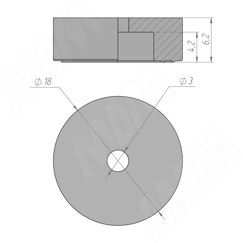 Размеры круглого подпятника D18 мм, h6 мм, под саморез (артикул HR18-6-P)