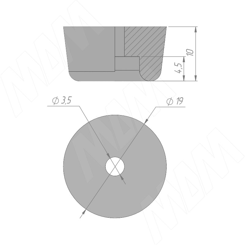 Размеры круглого подпятника D19 мм, h10 мм, под саморез (артикул HR19-10-P)
