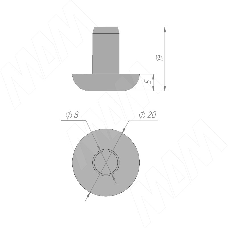Размеры круглого подпятника D20 мм, для отверстия 8 мм (артикул HL-R.20-8)