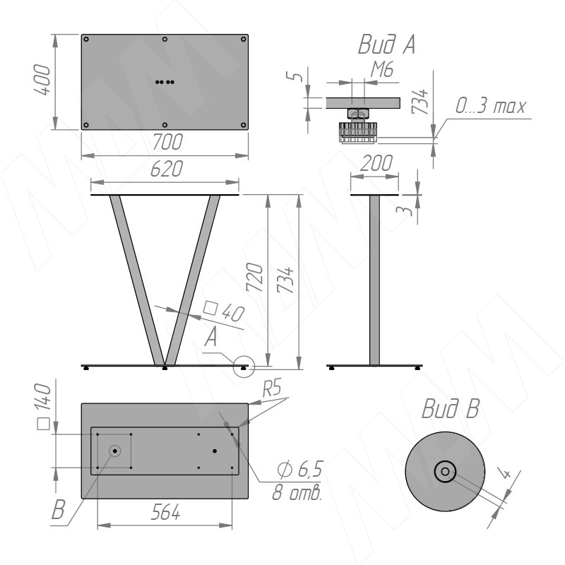 Размеры подстолья ВАЛЕНСА 700х400 мм, высота 730 мм, регулировка 3 мм (артикул VA730X700X400)