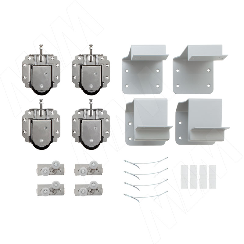 Комплектация: нижний ролик — 4 шт., верхний ролик — 4 шт., кронштейн — 4 шт., нижний стопор — 4 шт., верхний стопор — 4 шт.