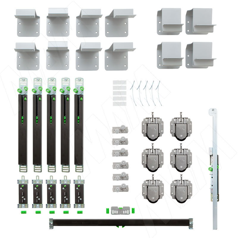 Комплектация: нижний ролик — 6 шт., верхний ролик — 6 шт., кронштейн — 11 шт., нижний стопор — 4 шт., верхний стопор — 4 шт., доводчик — 5 шт., активатор — 5 шт., доводчик средней двери — 1 шт., активатор для средней двери — 1 шт., активатор для соосных дверей — 1 шт.,