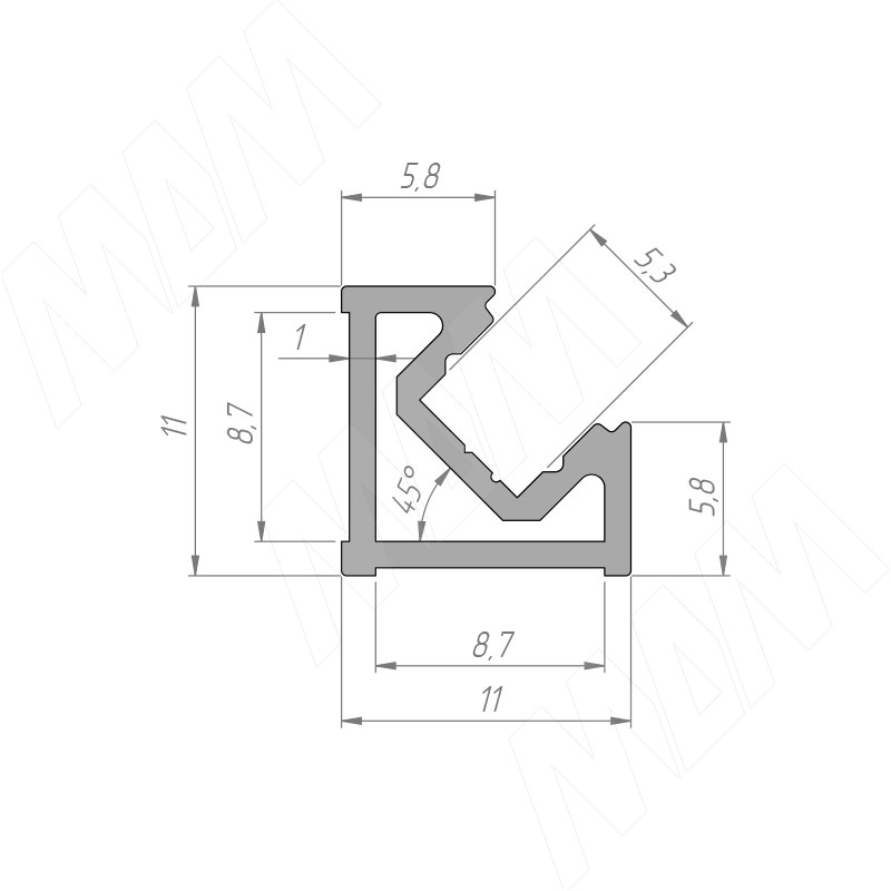 Размеры углового узкого профиля СМ7, 11х11 мм, для ленты с основанием 5 мм и углового рассеивателя (артикул LSP-CM7-ALU)Установка углового узкого профиля СМ7, 11х11 мм, для ленты с основанием 5 мм и углового рассеивателя (артикул LSP-CM7-ALU)
