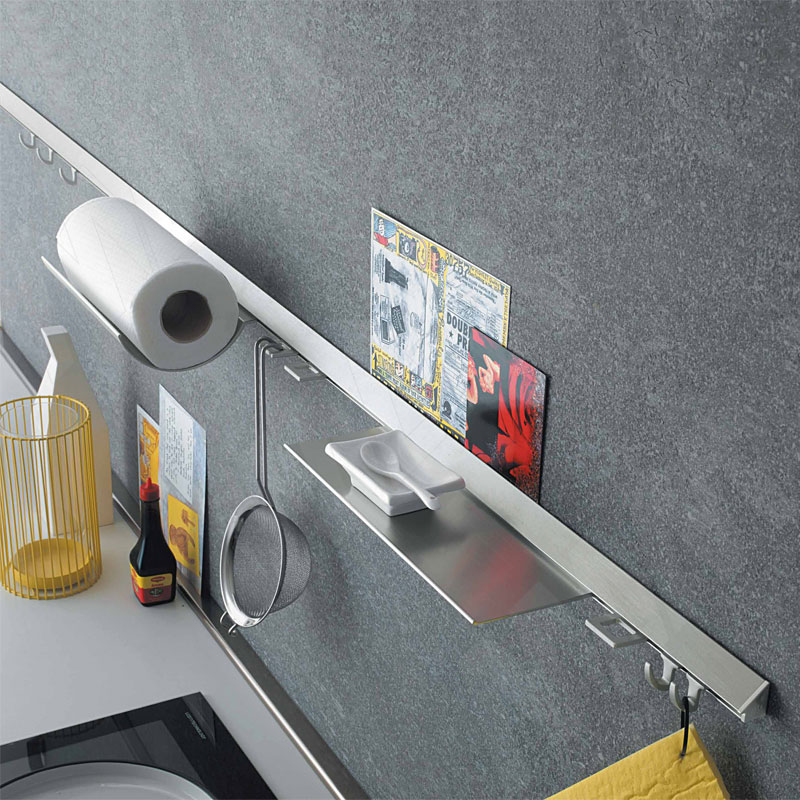 Комплектация: рейлинг 900 мм, заглушки для рейлинга, комплект крепежа, полка прямая, держатель для бумажного полотенца, крючок — 4 шт., держатель для половника — 2 шт.