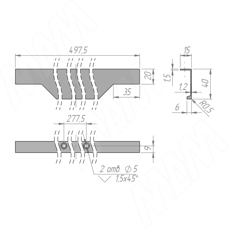 Размеры профиль-ручки с креплением на саморезы для фасада шириной 500 мм (артикул 25.500)Установка профиль-ручки с креплением на саморезы (артикул 25)