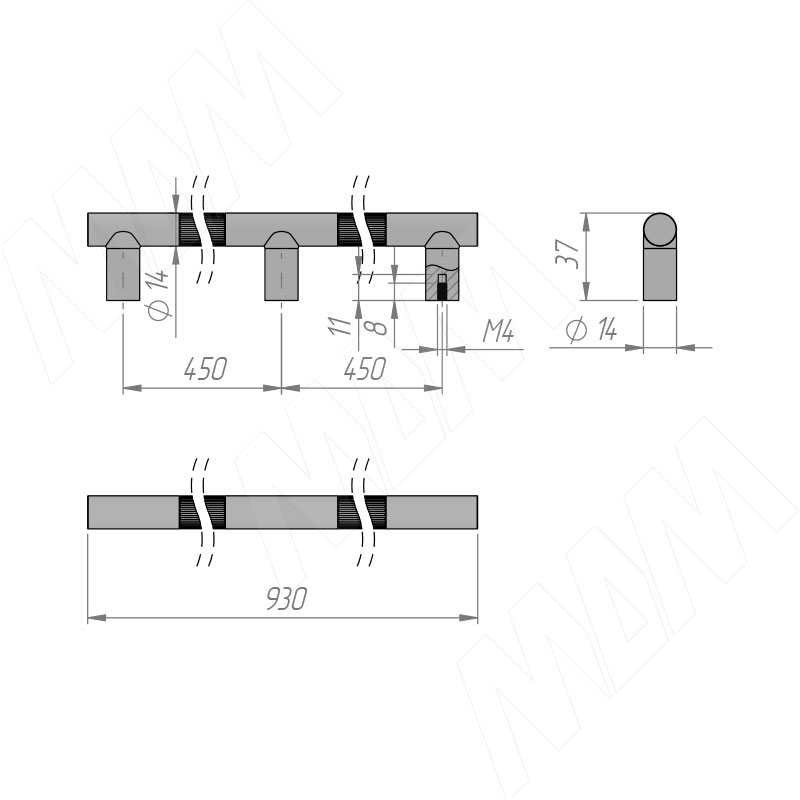 Размеры ручки-рейлинга с межцентровым расстоянием 450/900 мм (артикул WMN.887.900)